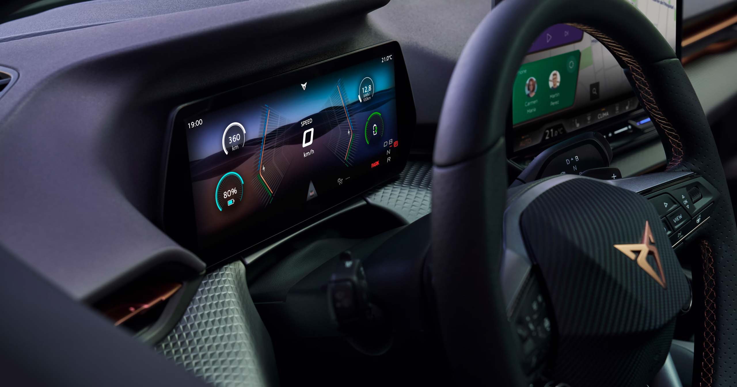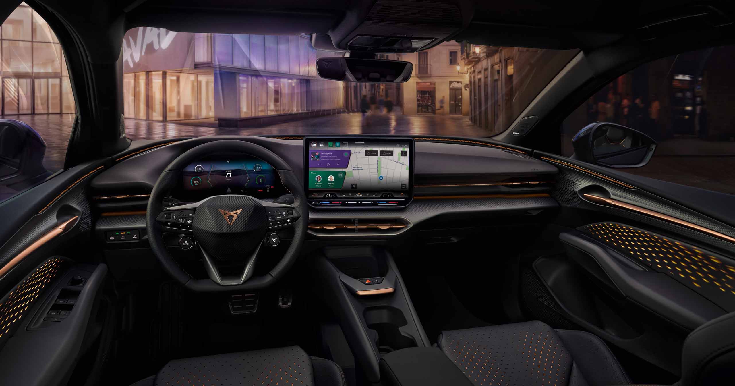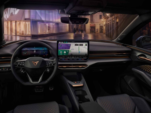 Puertas adentro, el CUPRA Raval apuesta por una experiencia inmersiva. El habitáculo combina una pantalla digital de 10,25 pulgadas con un sistema multimedia de 12,9”, integrando un ecosistema basado en Android con aplicaciones nativas y conectividad avanzada.